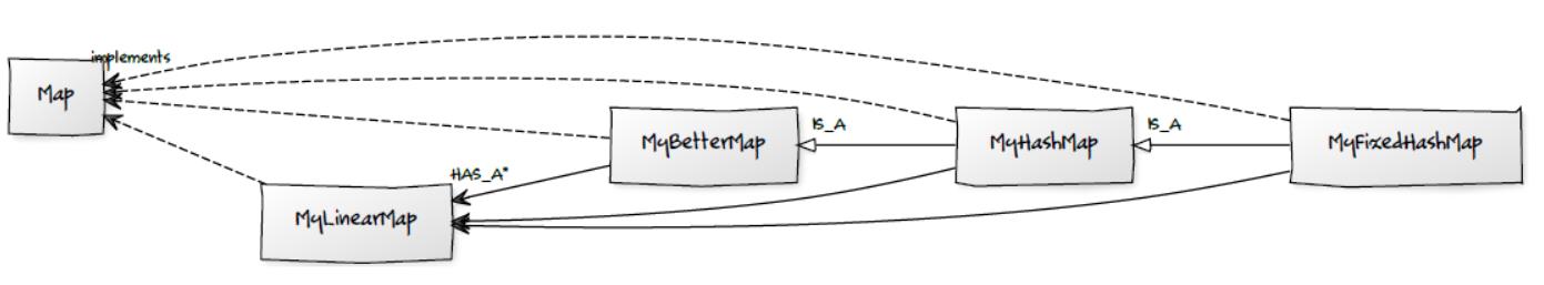 MyLinearMap包含一个LinkedList并实现了Map。MyBetterMap包含许多MyLinearMap对象并实现了Map。MyHashMap扩展了MyBetterMap,所以它也包含MyLinearMap对象,并实现了Map。MyFixedHashMap扩展了MyHashMap并实现了Map。